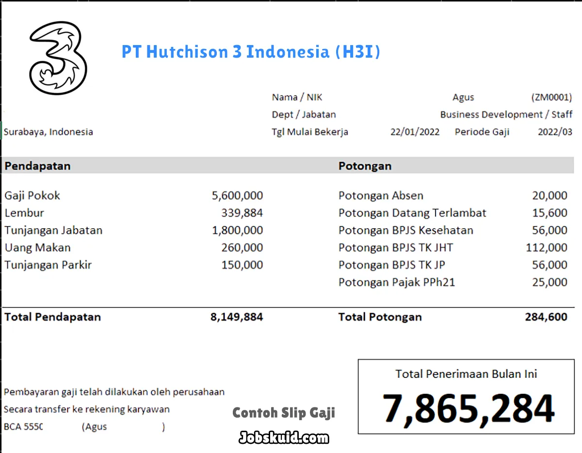 Gambar di atas adalah contoh slip gaji PT Hutchison 3 Indonesia (H3I). Slip gaji tersebut memuat informasi seperti gaji pokok, gaji lembur, bonus, tunjangan, potongan, dan total gaji.