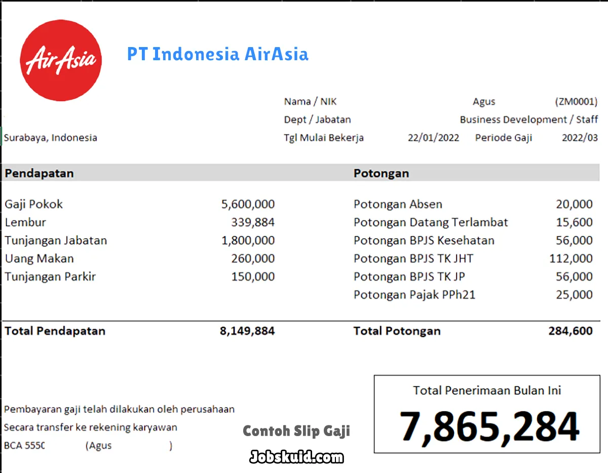 Gambar di atas adalah contoh slip gaji PT Indonesia AirAsia. Slip gaji tersebut memuat informasi seperti gaji pokok, gaji lembur, bonus, tunjangan, potongan, dan total gaji.