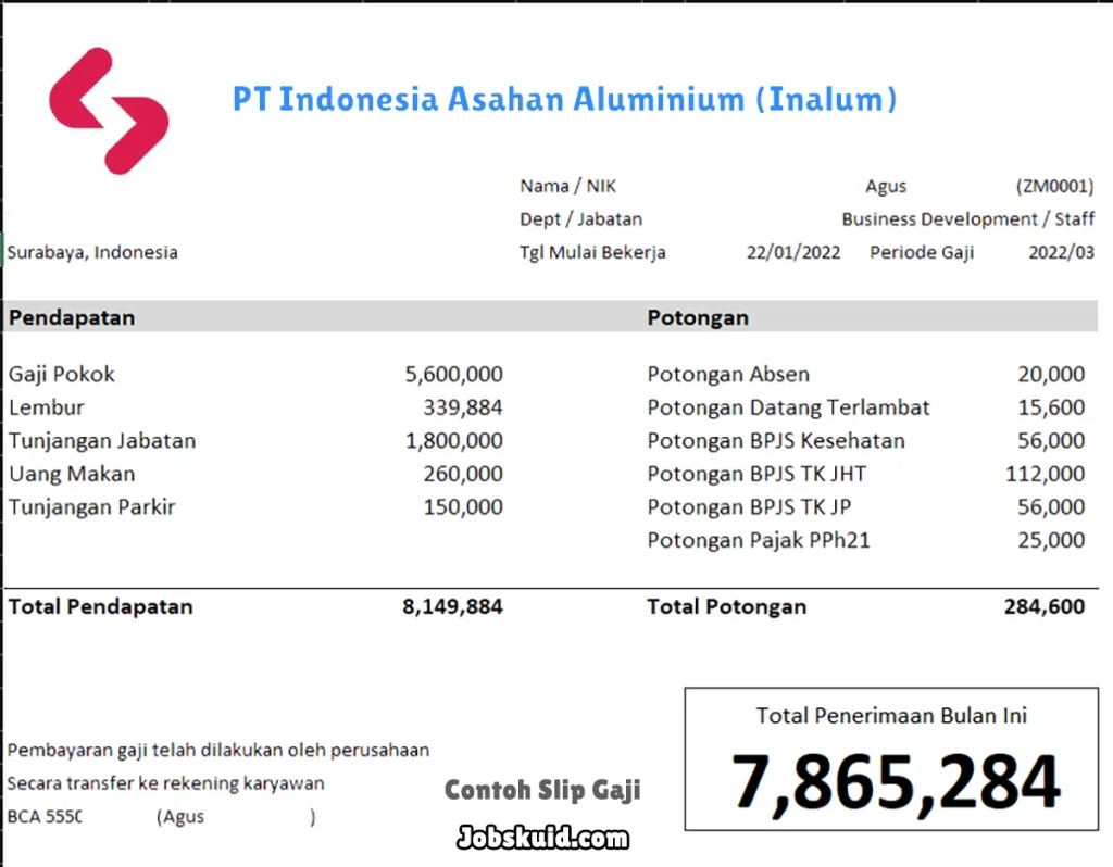Berikut ini adalah contoh slip gaji PT Indonesia Asahan Aluminium (Inalum).