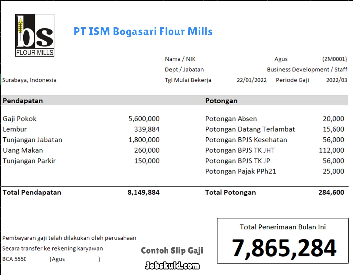 Gambar di atas adalah contoh slip gaji PT ISM Bogasari Flour Mills. Slip gaji tersebut memuat informasi seperti gaji pokok, gaji lembur, bonus, tunjangan, potongan, dan total gaji.