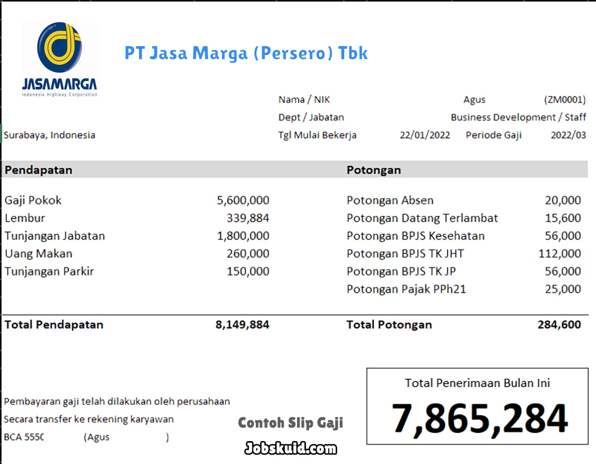Berikut ini adalah contoh slip gaji PT Jasa Marga (Persero) Tbk.