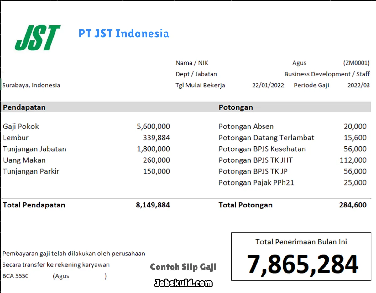 Gambar di atas adalah contoh slip gaji PT JST Indonesia. Slip gaji tersebut memuat informasi seperti gaji pokok, gaji lembur, bonus, tunjangan, potongan, dan total gaji.