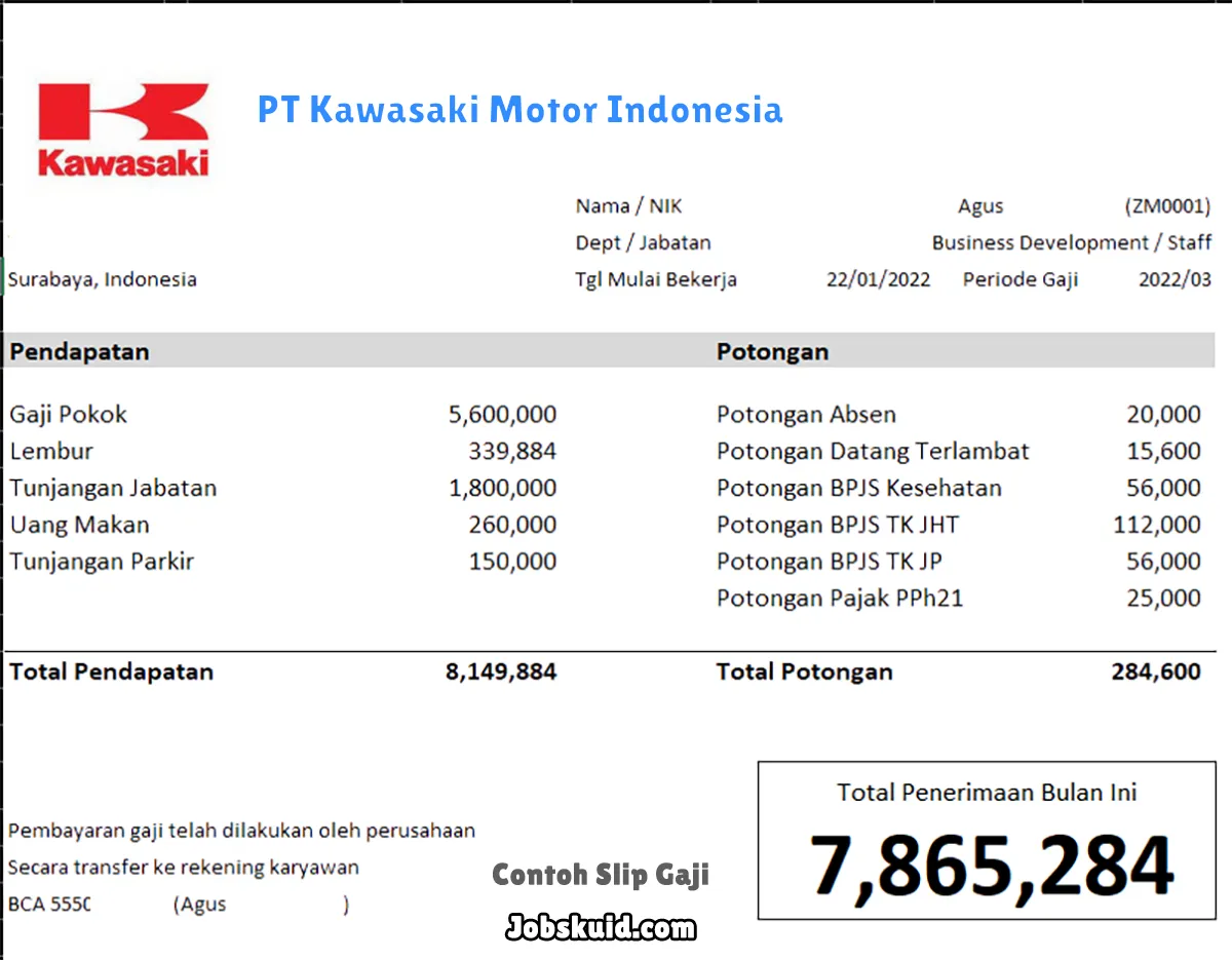 Berikut ini adalah contoh slip gaji PT Kawasaki Motor Indonesia.