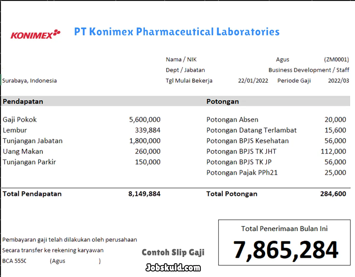 Gambar di atas adalah contoh slip gaji PT Konimex Pharmaceutical Laboratories. Slip gaji tersebut memuat informasi seperti gaji pokok, gaji lembur, bonus, tunjangan, potongan, dan total gaji.