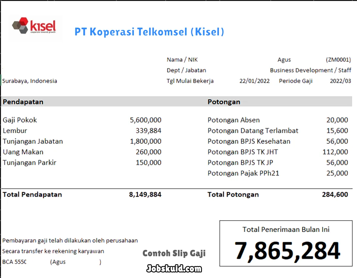 Gambar di atas adalah contoh slip gaji PT Koperasi Telkomsel (Kisel). Slip gaji tersebut memuat informasi seperti gaji pokok, gaji lembur, bonus, tunjangan, potongan, dan total gaji.