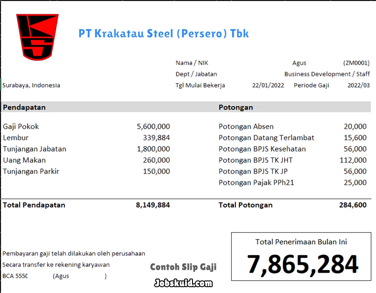 Gambar di atas adalah contoh slip gaji PT Krakatau Steel (Persero) Tbk. Slip gaji tersebut memuat informasi seperti gaji pokok, gaji lembur, bonus, tunjangan, potongan, dan total gaji.