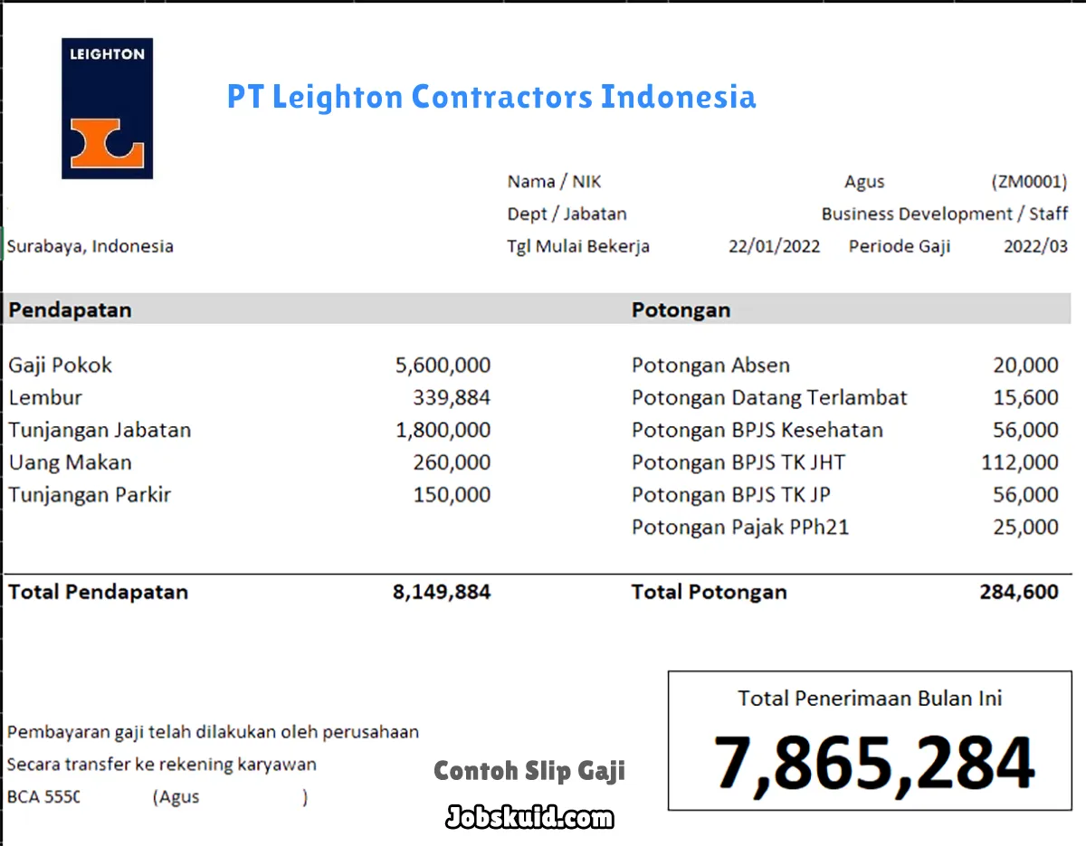Gambar di atas adalah contoh slip gaji PT Leighton Contractors Indonesia. Slip gaji tersebut memuat informasi seperti gaji pokok, gaji lembur, bonus, tunjangan, potongan, dan total gaji.