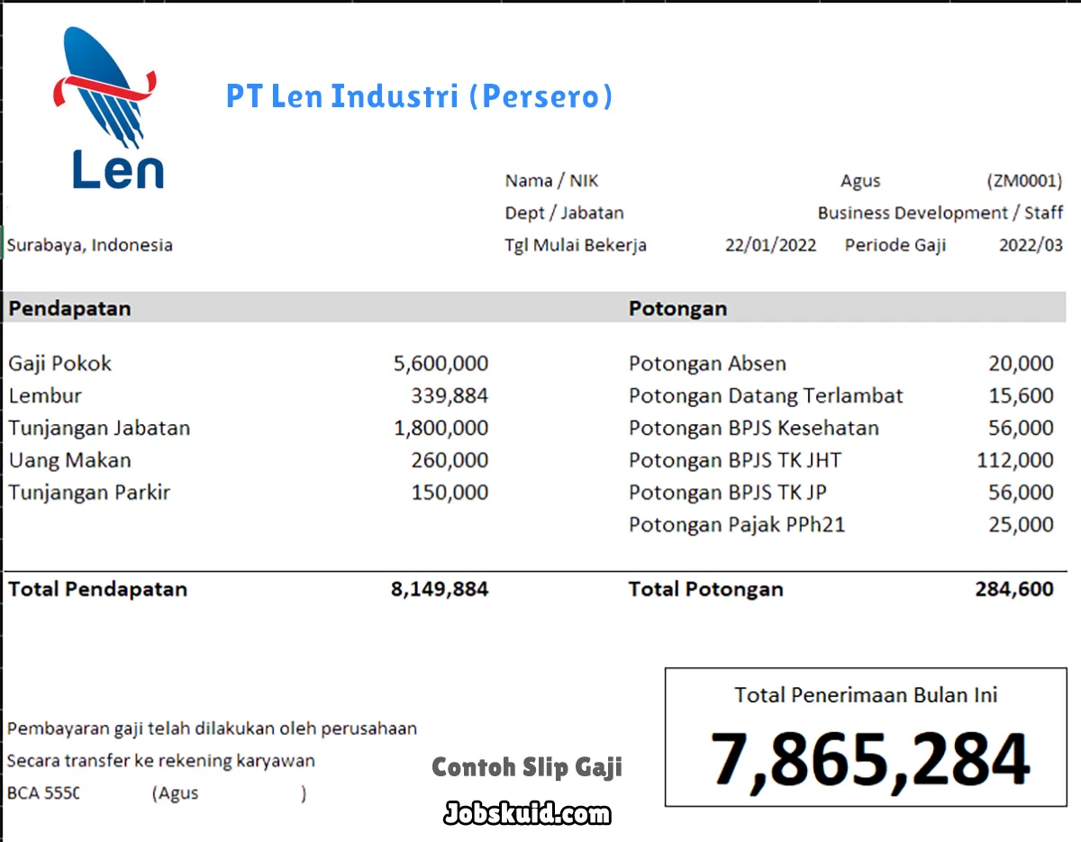 Gambar di atas adalah contoh slip gaji PT Len Industri (Persero). Slip gaji tersebut memuat informasi seperti gaji pokok, gaji lembur, bonus, tunjangan, potongan, dan total gaji.