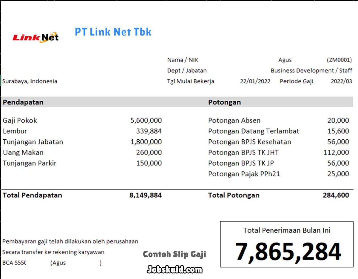 Gambar di atas adalah contoh slip gaji PT Link Net Tbk. Slip gaji tersebut memuat informasi seperti gaji pokok, gaji lembur, bonus, tunjangan, potongan, dan total gaji.