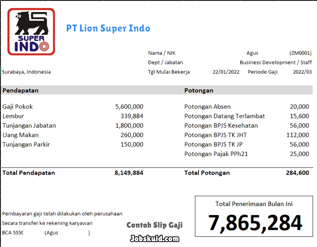 Gambar di atas adalah contoh slip gaji PT Lion Super Indo. Slip gaji tersebut memuat informasi seperti gaji pokok, gaji lembur, bonus, tunjangan, potongan, dan total gaji.