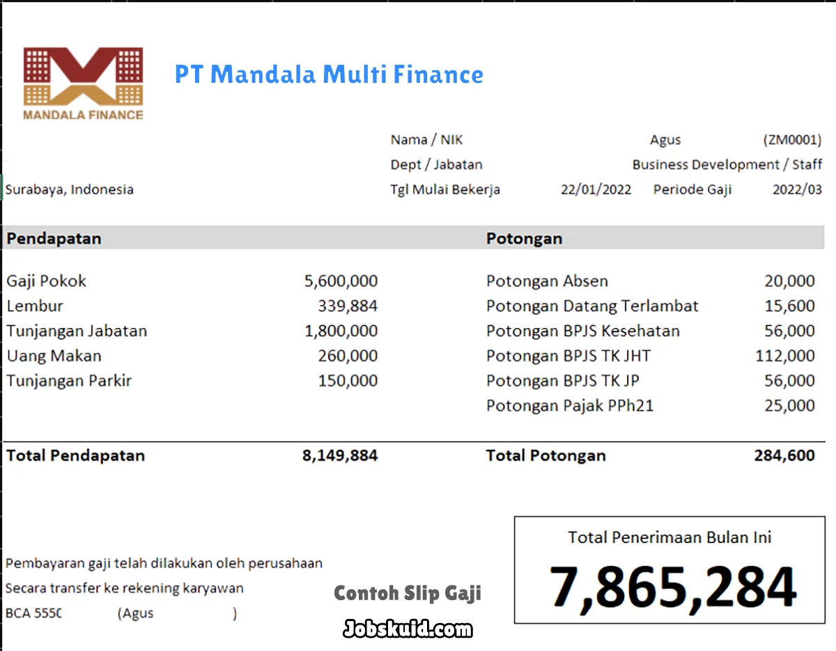 Gambar di atas adalah contoh slip gaji PT Mandala Multi Finance. Slip gaji tersebut memuat informasi seperti gaji pokok, gaji lembur, bonus, tunjangan, potongan, dan total gaji.