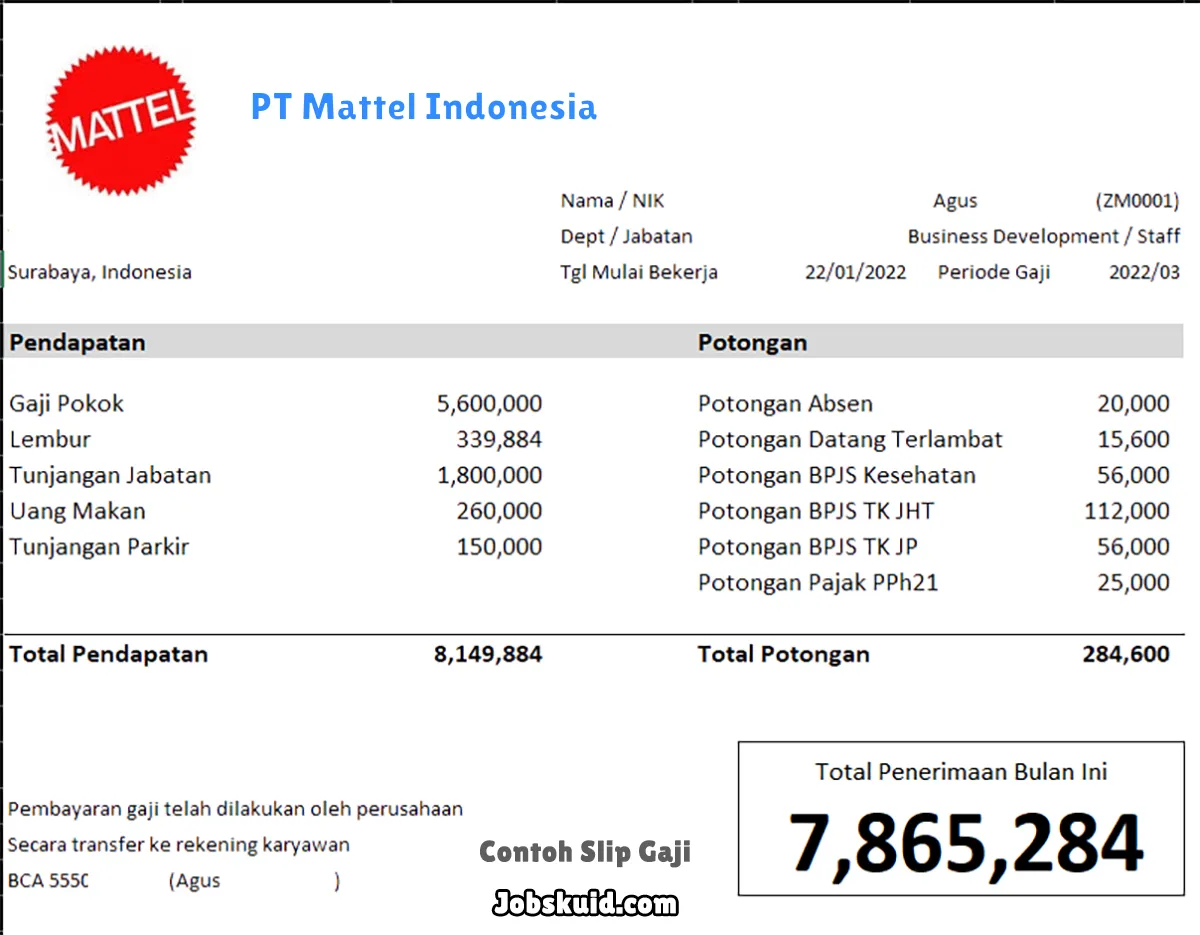 Gambar di atas adalah contoh slip gaji PT Mattel Indonesia. Slip gaji tersebut memuat informasi seperti gaji pokok, gaji lembur, bonus, tunjangan, potongan, dan total gaji.