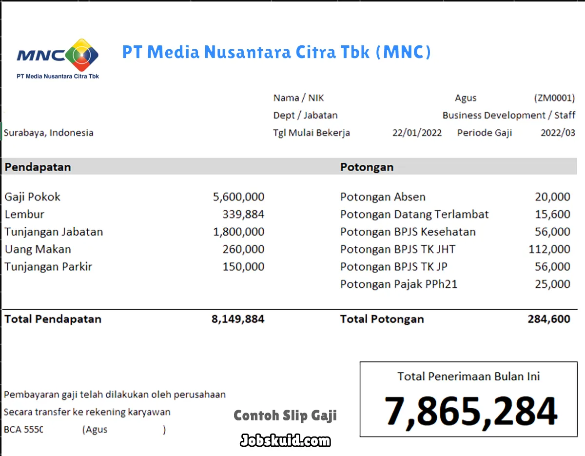 Gambar di atas adalah contoh slip gaji PT Media Nusantara Citra Tbk (MNC). Slip gaji tersebut memuat informasi seperti gaji pokok, gaji lembur, bonus, tunjangan, potongan, dan total gaji.