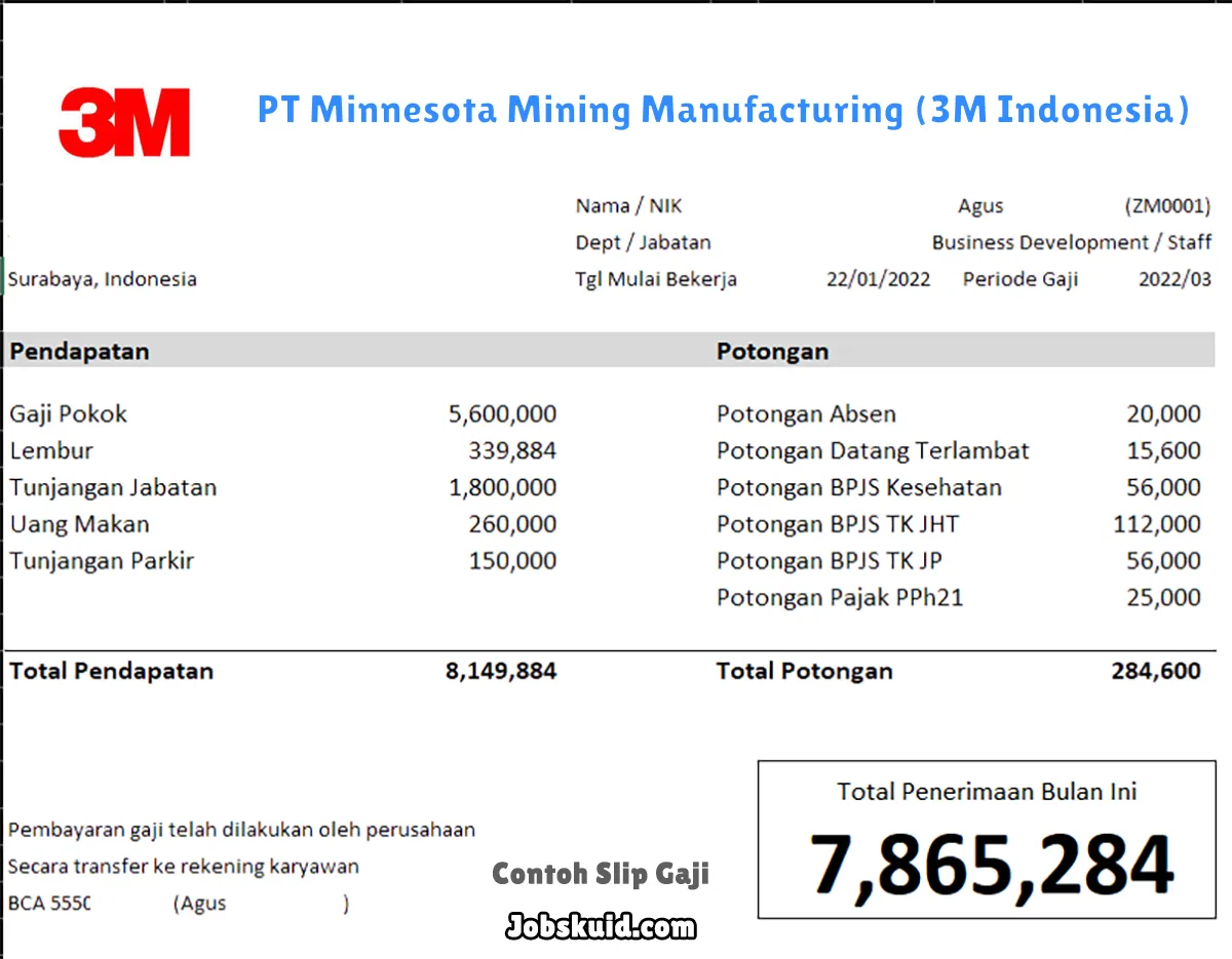 Berikut ini adalah contoh slip gaji PT Minnesota Mining Manufacturing (3M Indonesia).