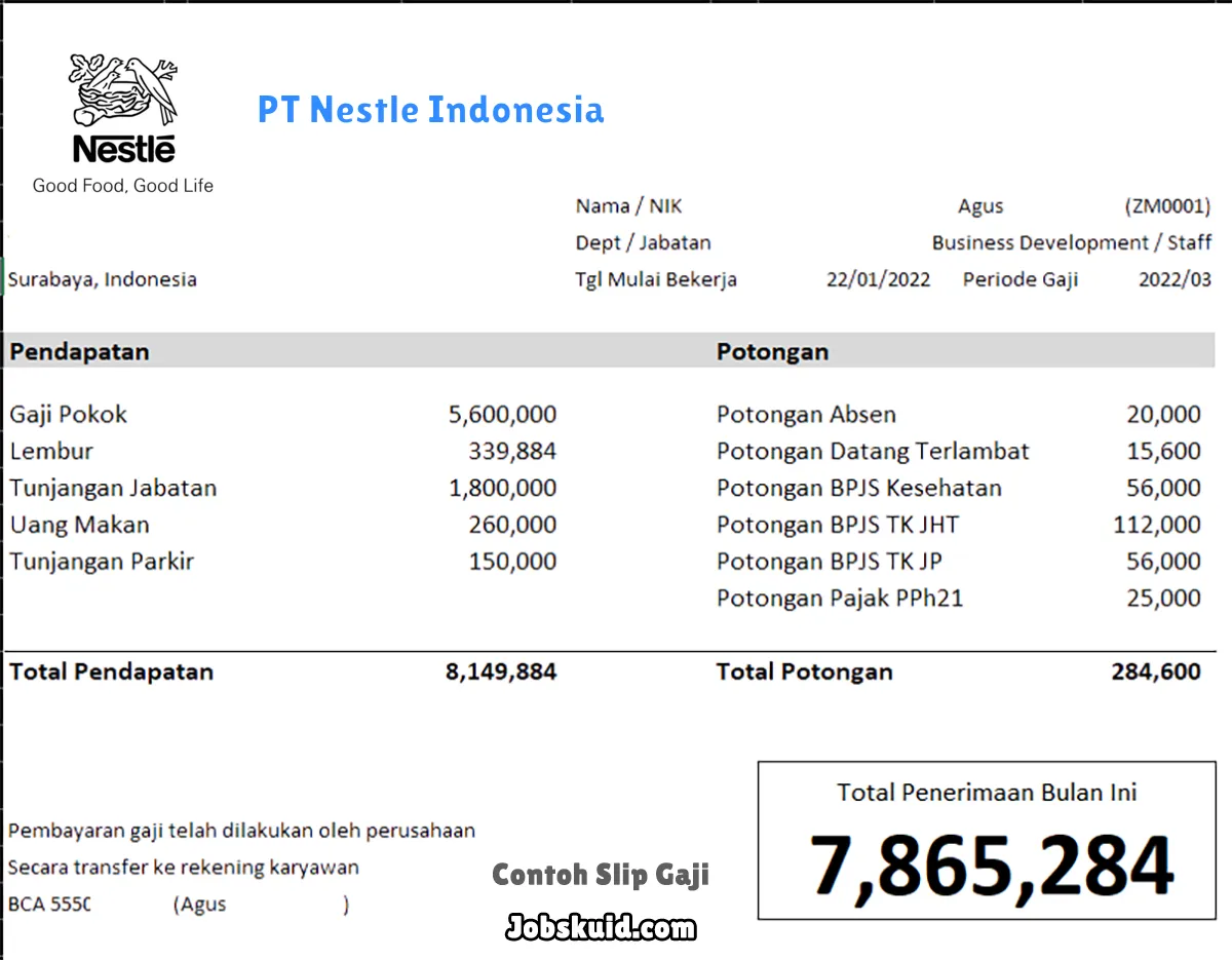 Berikut ini adalah contoh slip gaji PT Nestle Indonesia.