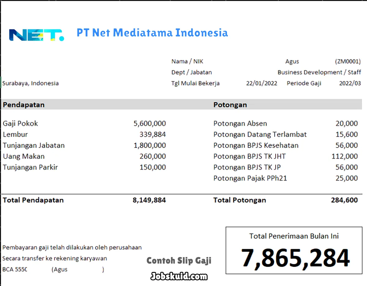 Gambar di atas adalah contoh slip gaji PT Net Mediatama Indonesia. Slip gaji tersebut memuat informasi seperti gaji pokok, gaji lembur, bonus, tunjangan, potongan, dan total gaji.
