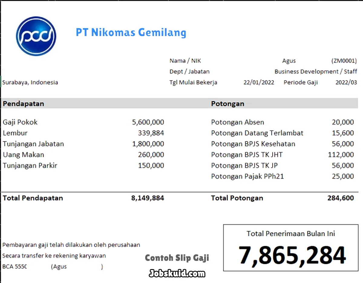 Gambar di atas adalah contoh slip gaji PT Nikomas Gemilang. Slip gaji tersebut memuat informasi seperti gaji pokok, gaji lembur, bonus, tunjangan, potongan, dan total gaji.