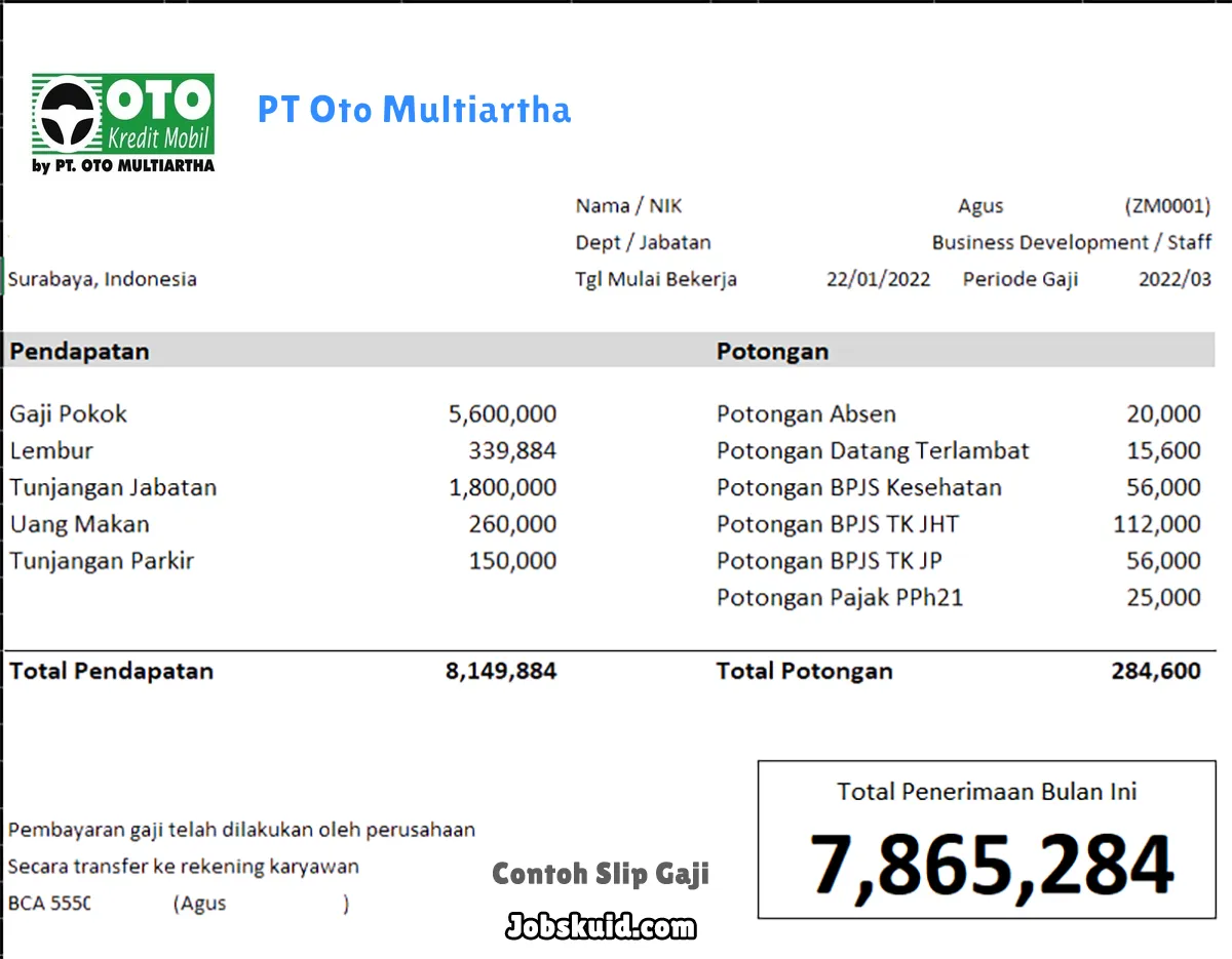Gambar di atas adalah contoh slip gaji PT Oto Multiartha. Slip gaji tersebut memuat informasi seperti gaji pokok, gaji lembur, bonus, tunjangan, potongan, dan total gaji.