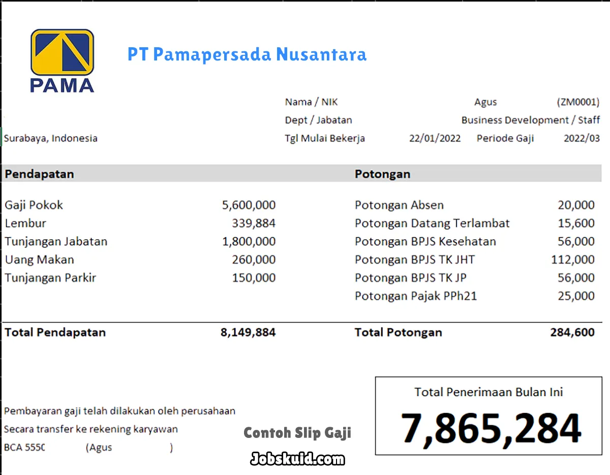 Gambar di atas adalah contoh slip gaji PT Pamapersada Nusantara. Slip gaji tersebut memuat informasi seperti gaji pokok, gaji lembur, bonus, tunjangan, potongan, dan total gaji.