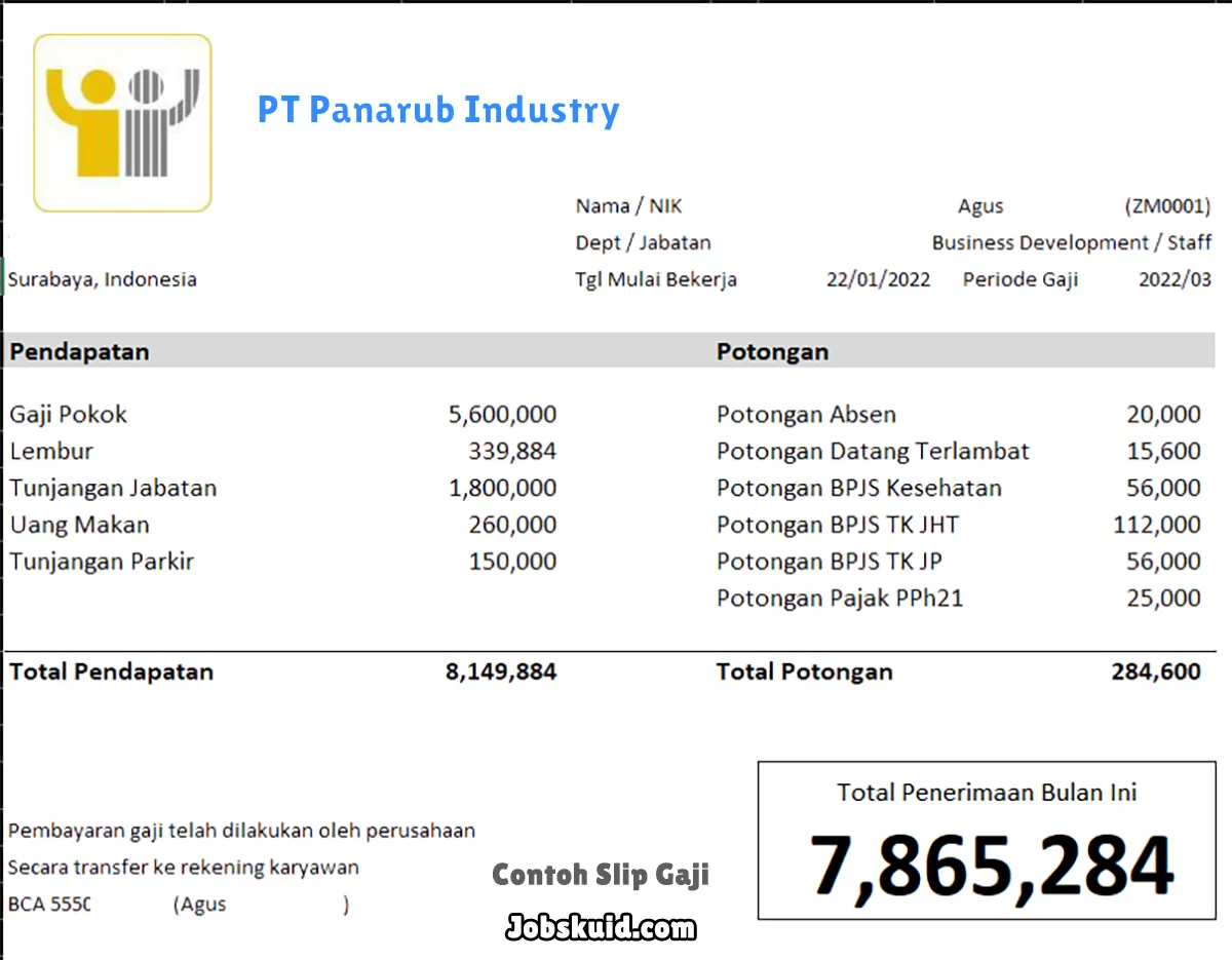 Gambar di atas adalah contoh slip gaji PT Panarub Industry. Slip gaji tersebut memuat informasi seperti gaji pokok, gaji lembur, bonus, tunjangan, potongan, dan total gaji.