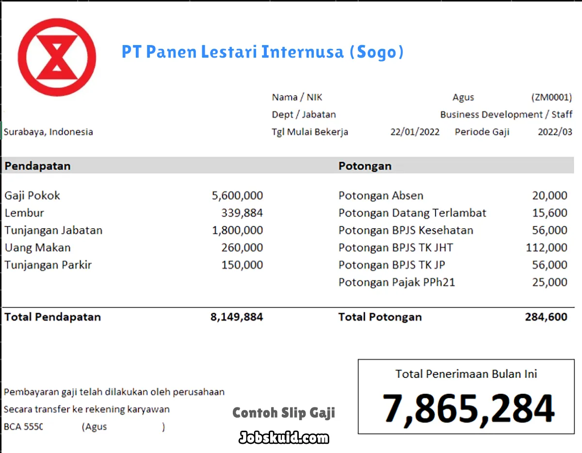 Gambar di atas adalah contoh slip gaji PT Panen Lestari Internusa (Sogo). Slip gaji tersebut memuat informasi seperti gaji pokok, gaji lembur, bonus, tunjangan, potongan, dan total gaji.
