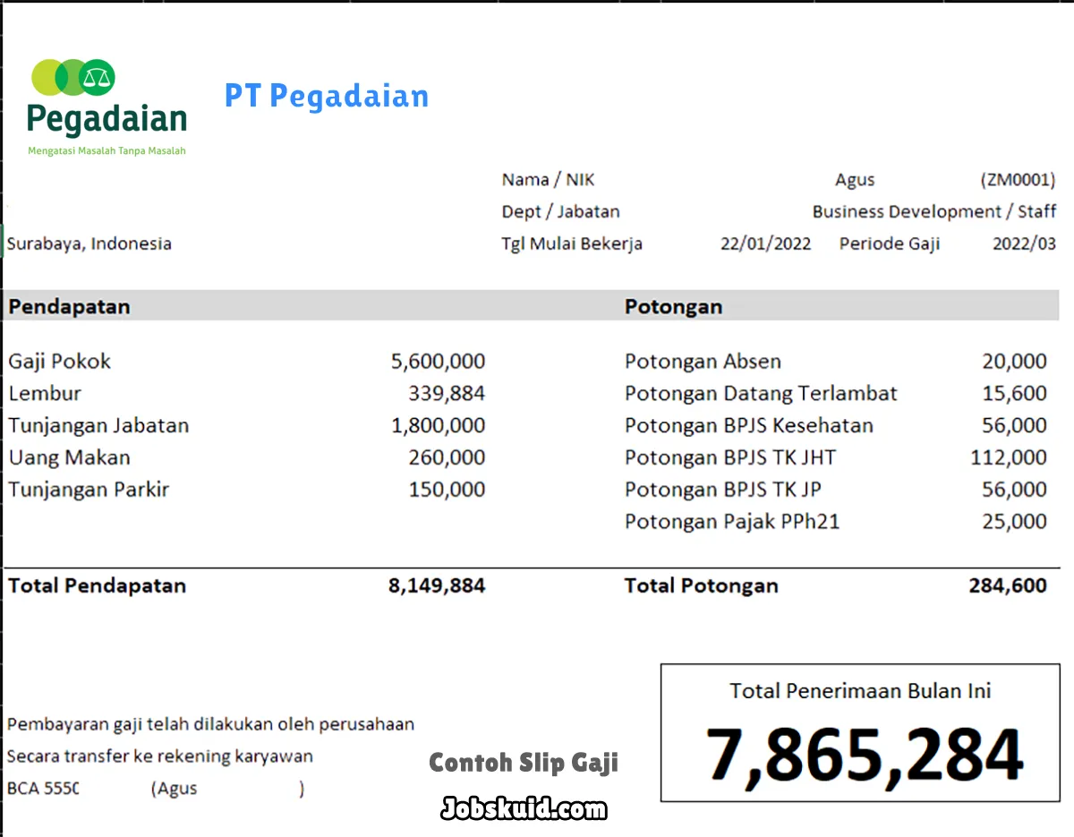 Gambar di atas adalah contoh slip gaji PT Pegadaian. Slip gaji tersebut memuat informasi seperti gaji pokok, gaji lembur, bonus, tunjangan, potongan, dan total gaji.