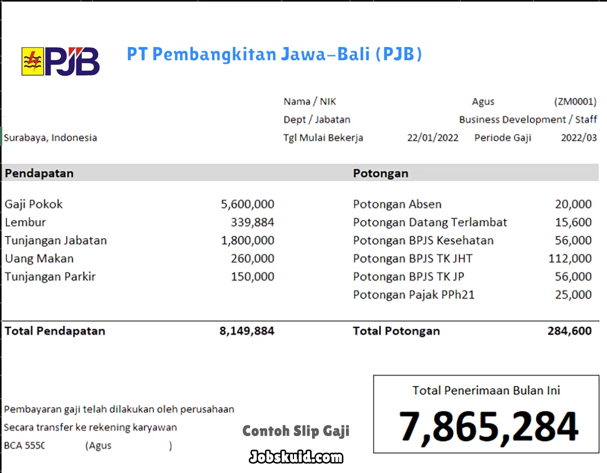 Berikut ini adalah contoh slip gaji PT Pembangkitan Jawa-Bali (PJB).
