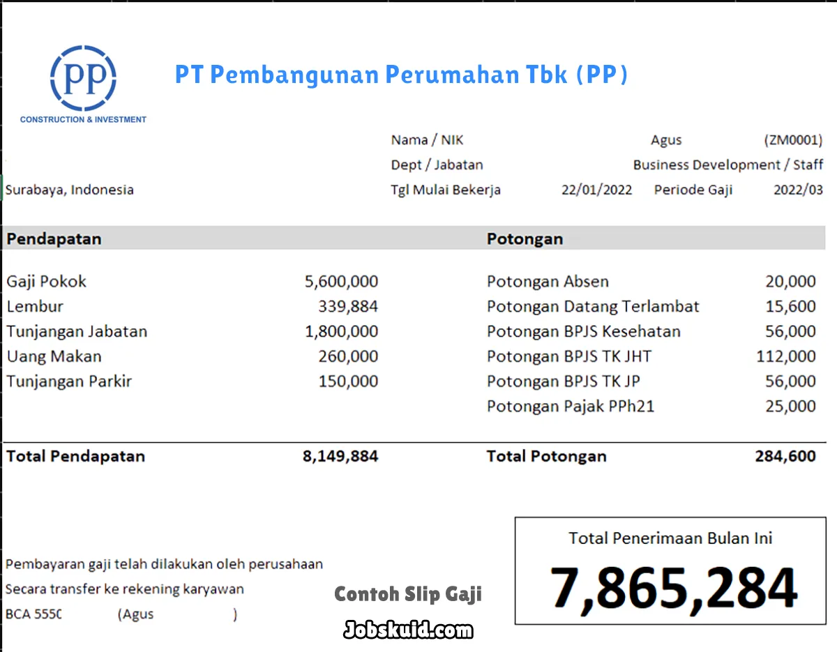 Gambar di atas adalah contoh slip gaji PT Pembangunan Perumahan Tbk (PP). Slip gaji tersebut memuat informasi seperti gaji pokok, gaji lembur, bonus, tunjangan, potongan, dan total gaji.