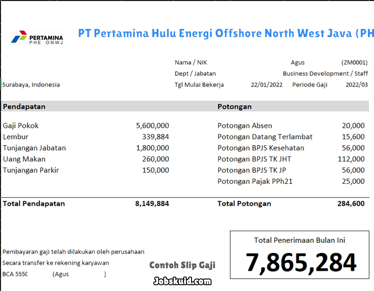 Gambar di atas adalah contoh slip gaji PT Pertamina Hulu Energi Offshore North West Java (PHE ONWJ). Slip gaji tersebut memuat informasi seperti gaji pokok, gaji lembur, bonus, tunjangan, potongan, dan total gaji.