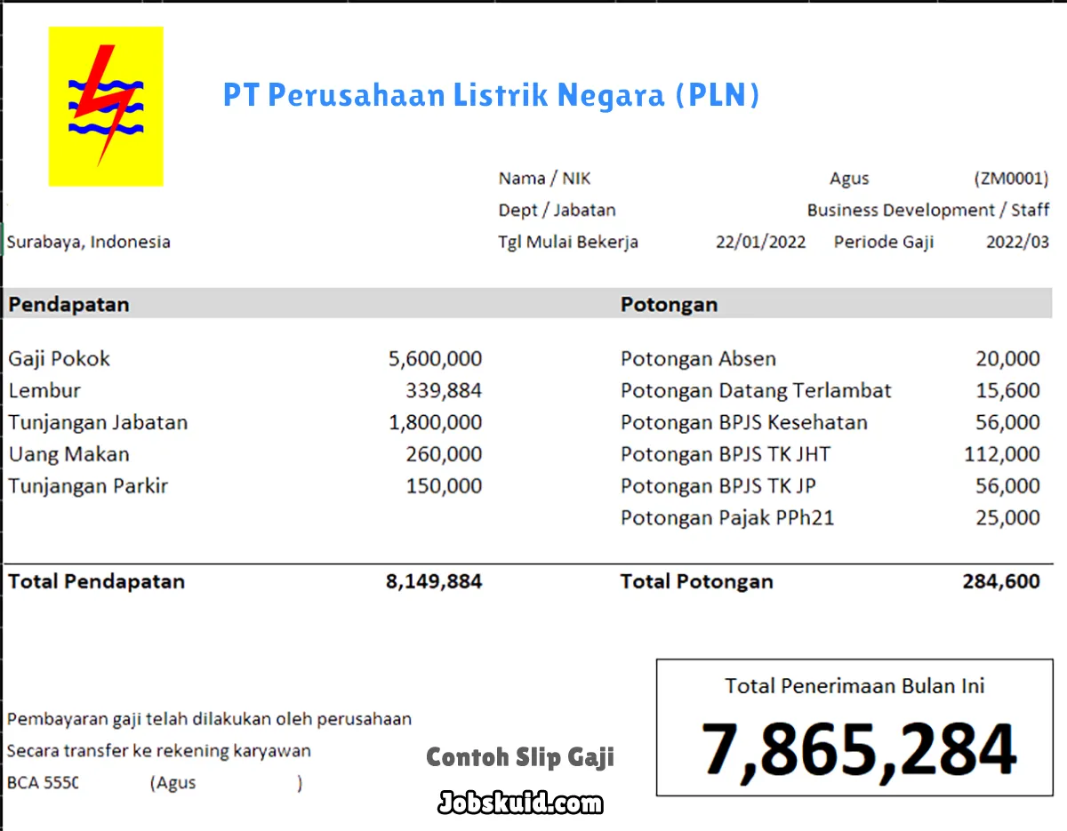 Gambar di atas adalah contoh slip gaji PT Perusahaan Listrik Negara (PLN). Slip gaji tersebut memuat informasi seperti gaji pokok, gaji lembur, bonus, tunjangan, potongan, dan total gaji.