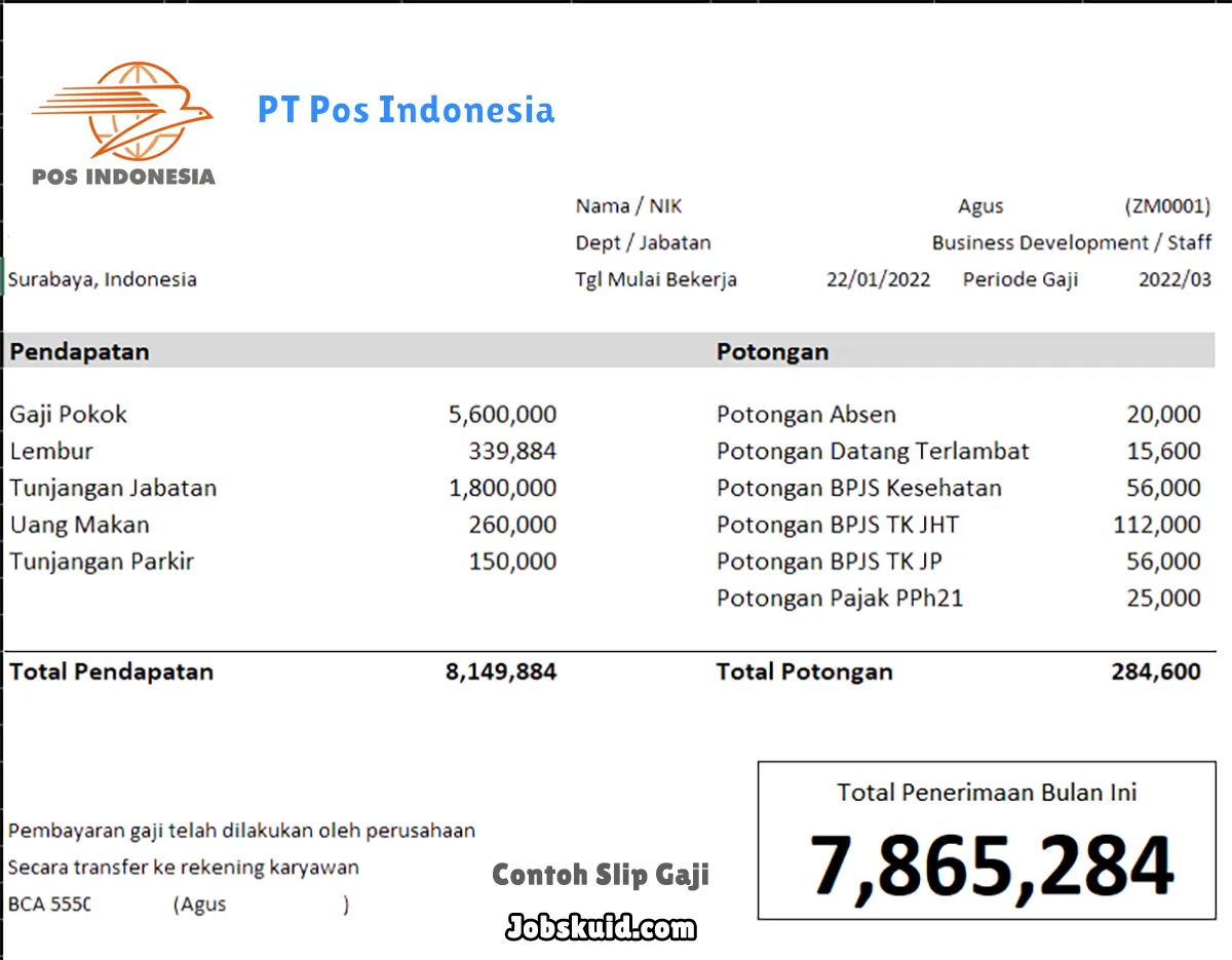 Gambar di atas adalah contoh slip gaji PT Pos Indonesia. Slip gaji tersebut memuat informasi seperti gaji pokok, gaji lembur, bonus, tunjangan, potongan, dan total gaji.