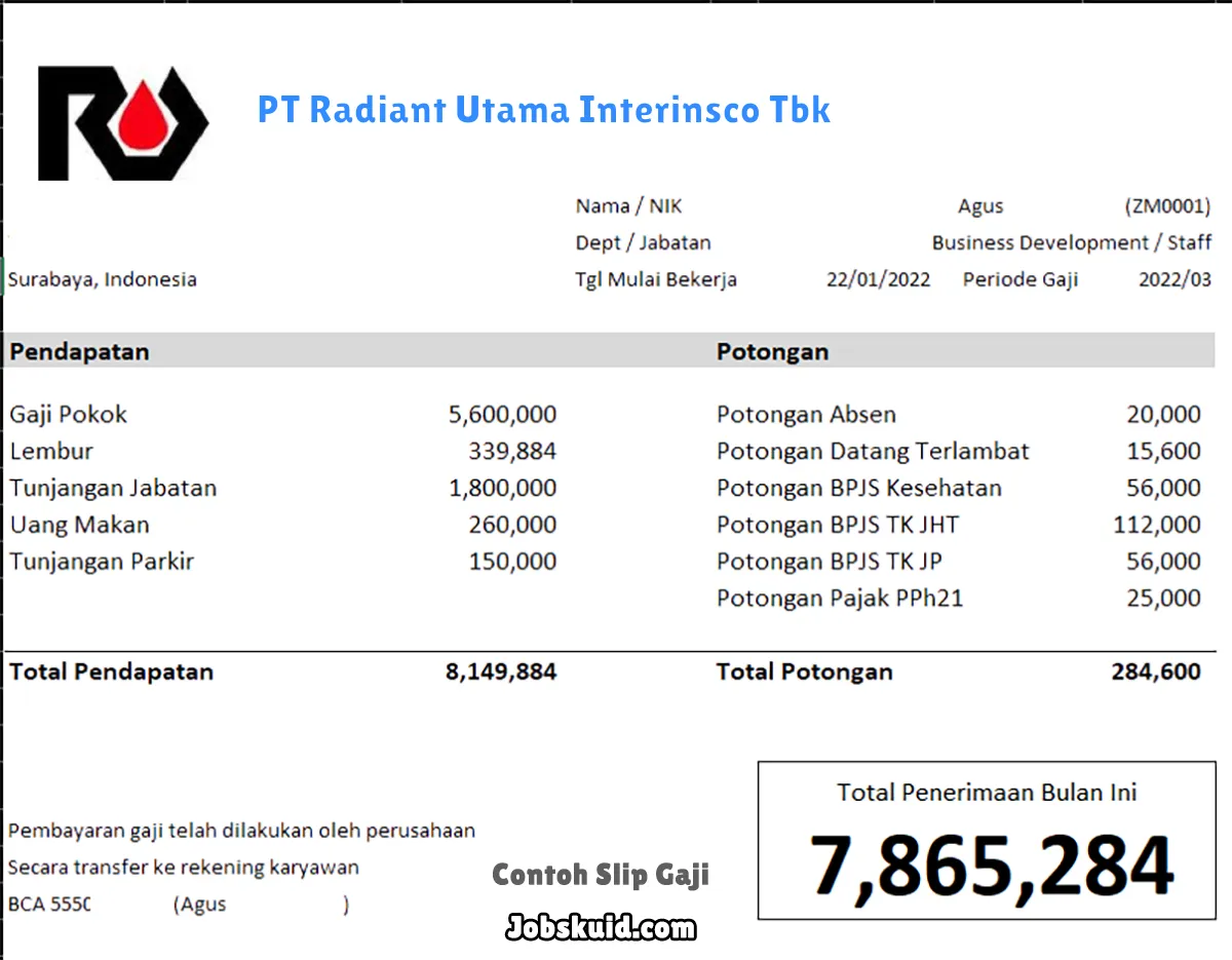 Gambar di atas adalah contoh slip gaji PT Radiant Utama Interinsco Tbk. Slip gaji tersebut memuat informasi seperti gaji pokok, gaji lembur, bonus, tunjangan, potongan, dan total gaji.