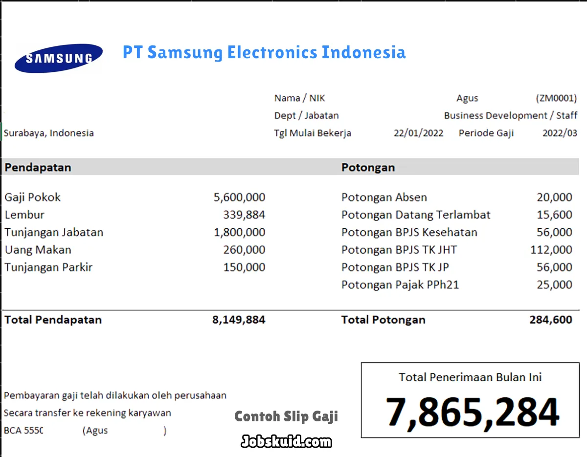 Gambar di atas adalah contoh slip gaji PT Samsung Electronics Indonesia. Slip gaji tersebut memuat informasi seperti gaji pokok, gaji lembur, bonus, tunjangan, potongan, dan total gaji.