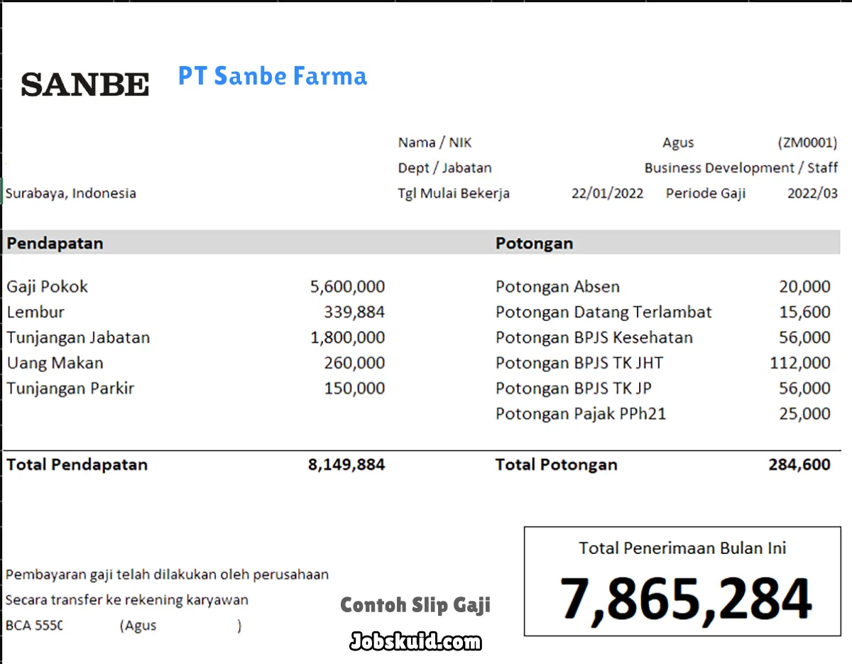 Gambar di atas adalah contoh slip gaji PT Sanbe Farma. Slip gaji tersebut memuat informasi seperti gaji pokok, gaji lembur, bonus, tunjangan, potongan, dan total gaji.