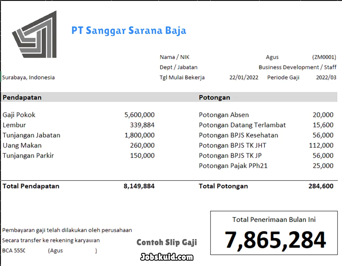 Gambar di atas adalah contoh slip gaji PT Sanggar Sarana Baja. Slip gaji tersebut memuat informasi seperti gaji pokok, gaji lembur, bonus, tunjangan, potongan, dan total gaji.