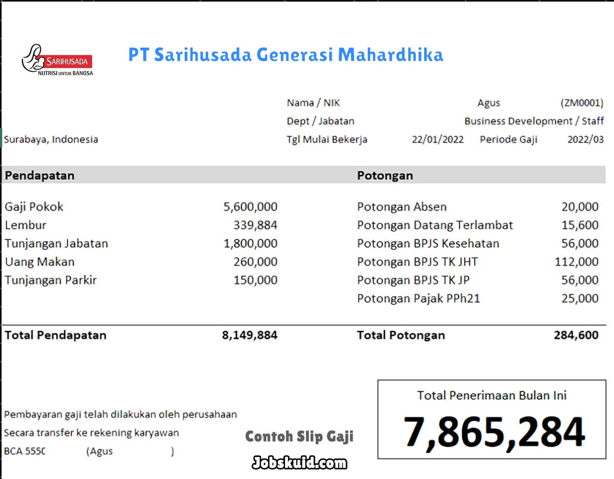 Gambar di atas adalah contoh slip gaji PT Sarihusada Generasi Mahardhika. Slip gaji tersebut memuat informasi seperti gaji pokok, gaji lembur, bonus, tunjangan, potongan, dan total gaji.