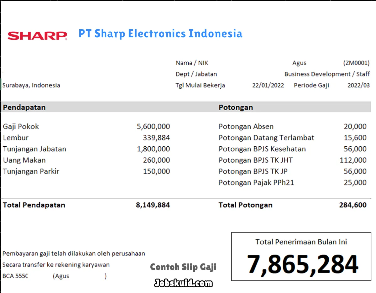 Berikut ini adalah contoh slip gaji PT Sharp Electronics Indonesia.