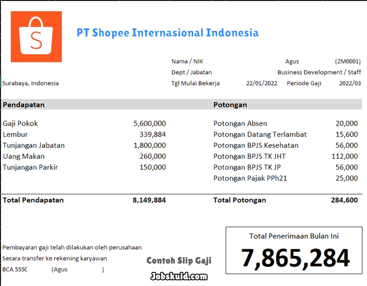 Berikut ini adalah contoh slip gaji PT Shopee Internasional Indonesia.