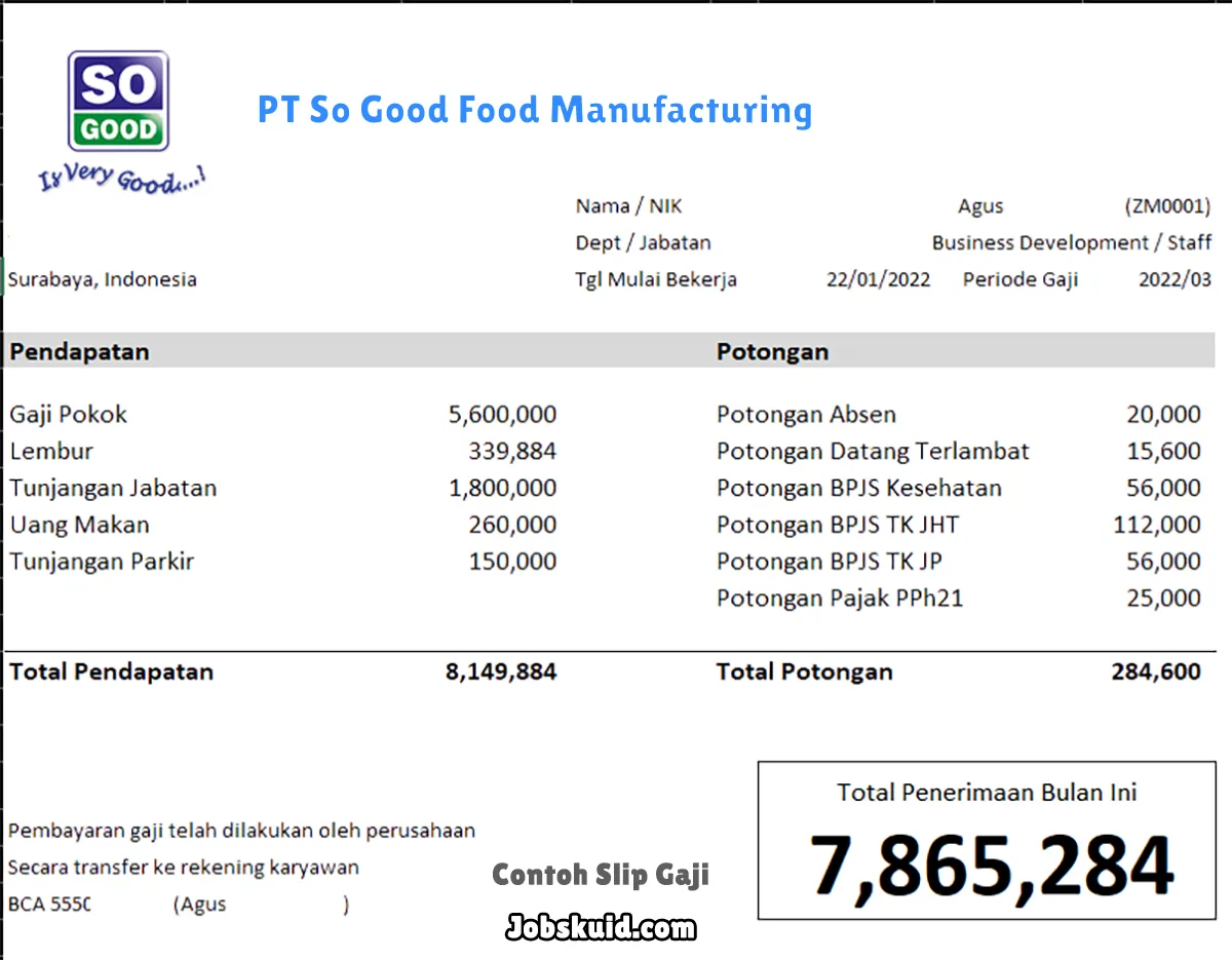 Gambar di atas adalah contoh slip gaji PT So Good Food Manufacturing. Slip gaji tersebut memuat informasi seperti gaji pokok, gaji lembur, bonus, tunjangan, potongan, dan total gaji.