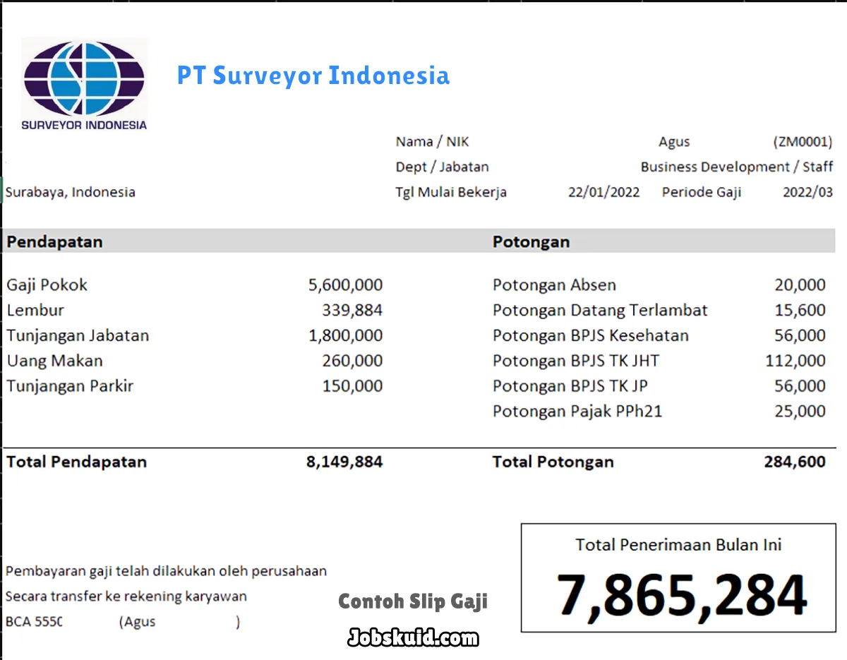 Gambar di atas adalah contoh slip gaji PT Surveyor Indonesia. Slip gaji tersebut memuat informasi seperti gaji pokok, gaji lembur, bonus, tunjangan, potongan, dan total gaji.
