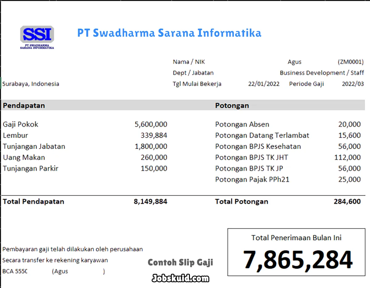 Gambar di atas adalah contoh slip gaji PT Swadharma Sarana Informatika. Slip gaji tersebut memuat informasi seperti gaji pokok, gaji lembur, bonus, tunjangan, potongan, dan total gaji.