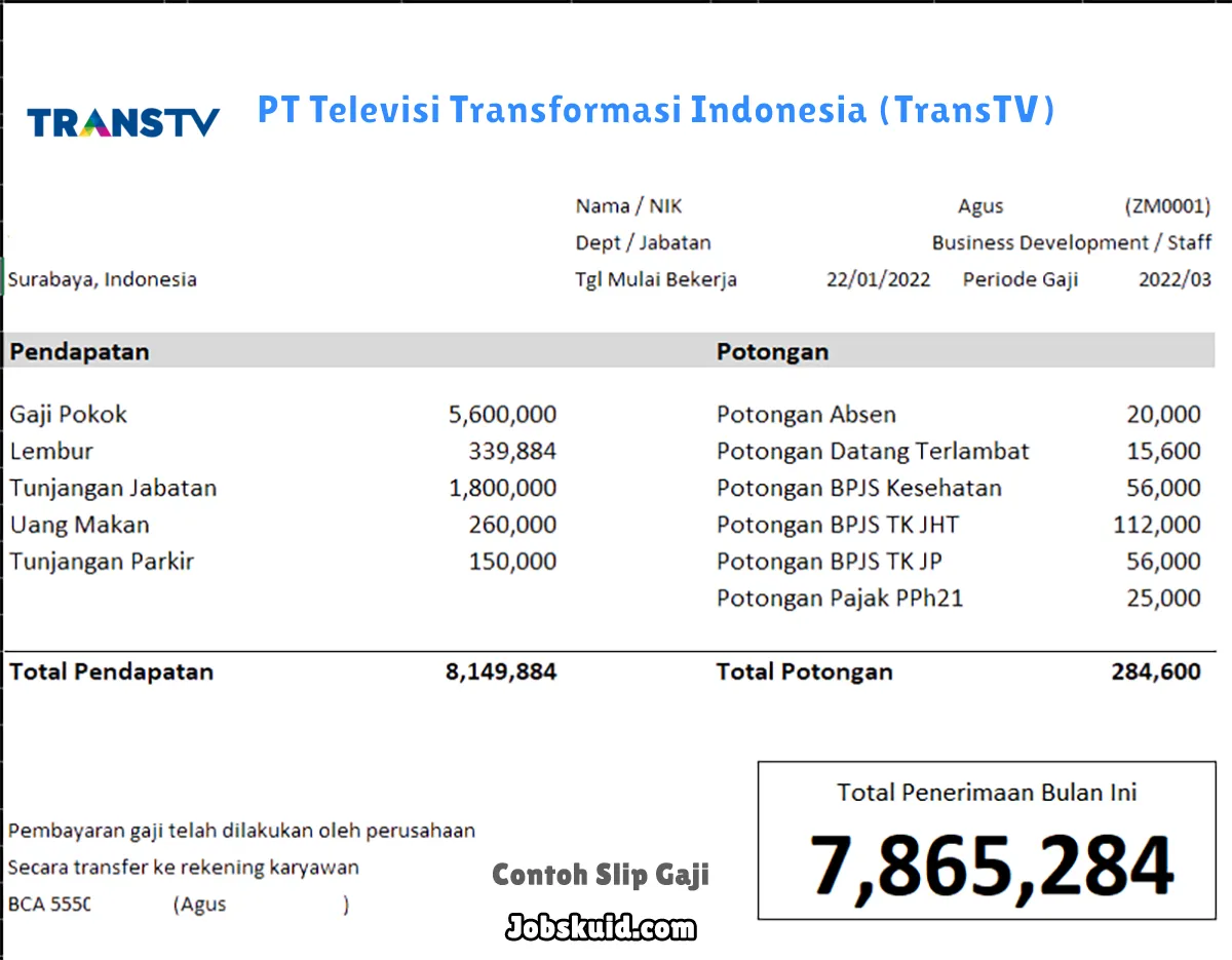 Berikut ini adalah contoh slip gaji PT Televisi Transformasi Indonesia (TransTV).