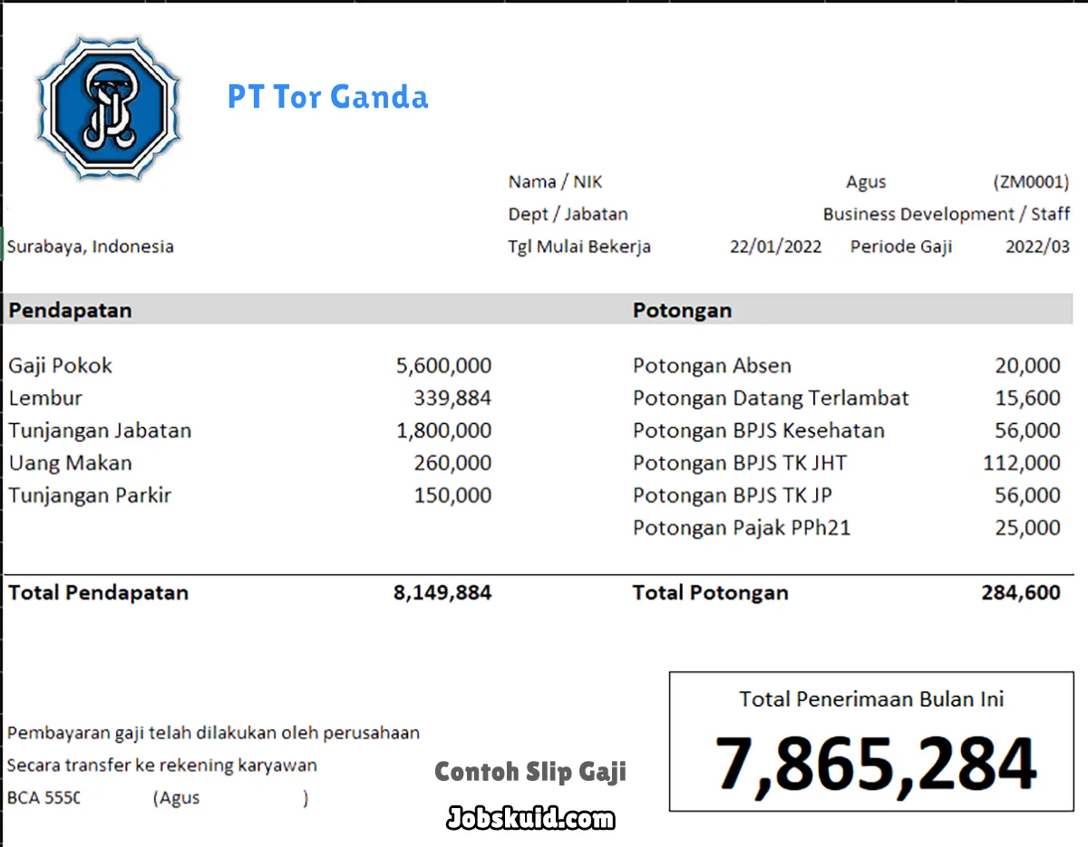 Gambar di atas adalah contoh slip gaji PT Tor Ganda. Slip gaji tersebut memuat informasi seperti gaji pokok, gaji lembur, bonus, tunjangan, potongan, dan total gaji.