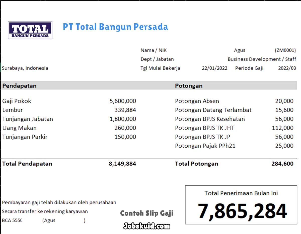 Gambar di atas adalah contoh slip gaji PT Total Bangun Persada. Slip gaji tersebut memuat informasi seperti gaji pokok, gaji lembur, bonus, tunjangan, potongan, dan total gaji.