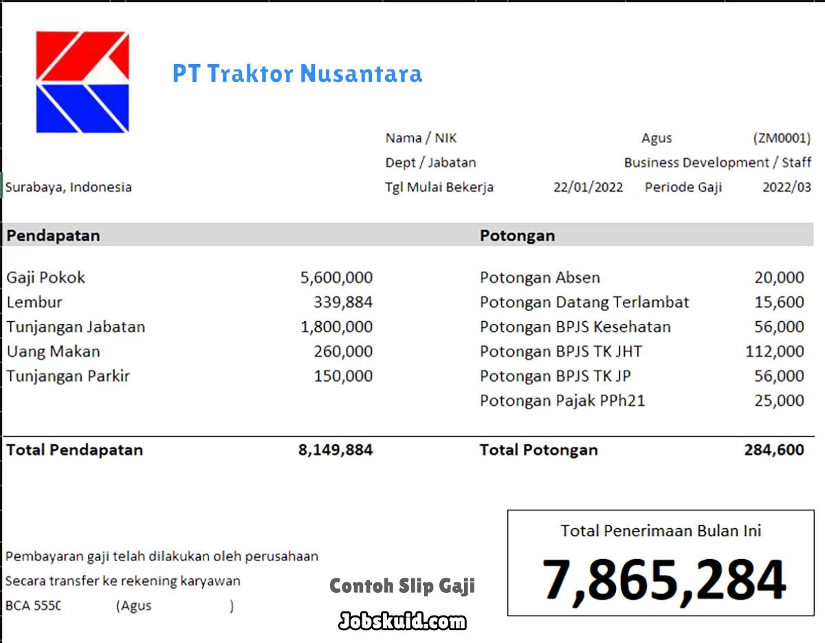 Gambar di atas adalah contoh slip gaji PT Traktor Nusantara. Slip gaji tersebut memuat informasi seperti gaji pokok, gaji lembur, bonus, tunjangan, potongan, dan total gaji.