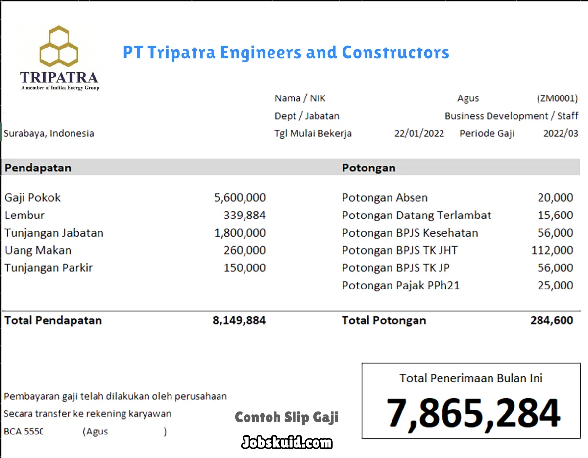 Gambar di atas adalah contoh slip gaji PT Tripatra Engineers and Constructors. Slip gaji tersebut memuat informasi seperti gaji pokok, gaji lembur, bonus, tunjangan, potongan, dan total gaji.