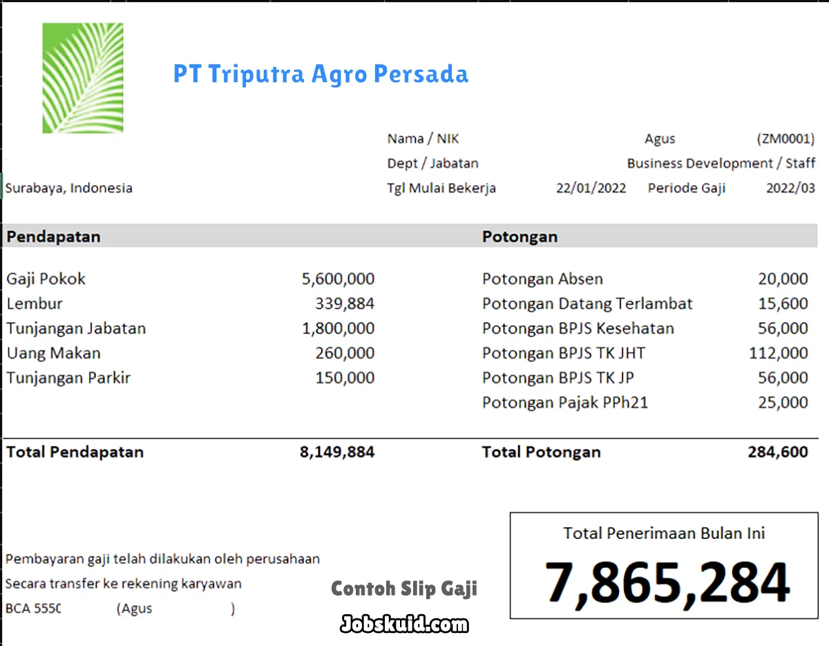 Gambar di atas adalah contoh slip gaji PT Triputra Agro Persada. Slip gaji tersebut memuat informasi seperti gaji pokok, gaji lembur, bonus, tunjangan, potongan, dan total gaji.