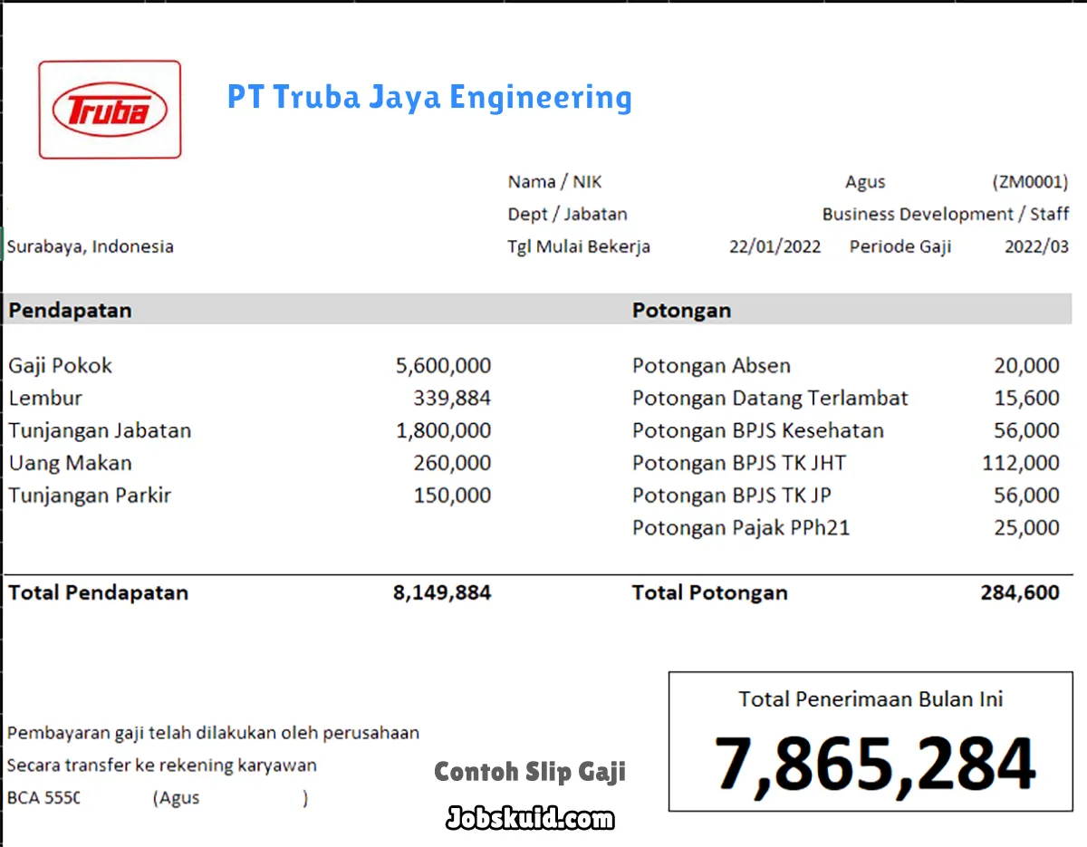 Gambar di atas adalah contoh slip gaji PT Truba Jaya Engineering. Slip gaji tersebut memuat informasi seperti gaji pokok, gaji lembur, bonus, tunjangan, potongan, dan total gaji.