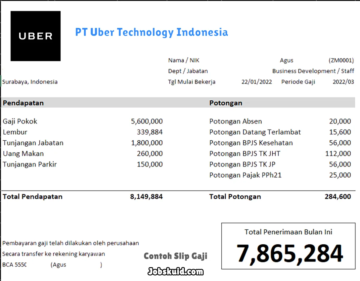 Gambar di atas adalah contoh slip gaji PT Uber Technology Indonesia. Slip gaji tersebut memuat informasi seperti gaji pokok, gaji lembur, bonus, tunjangan, potongan, dan total gaji.