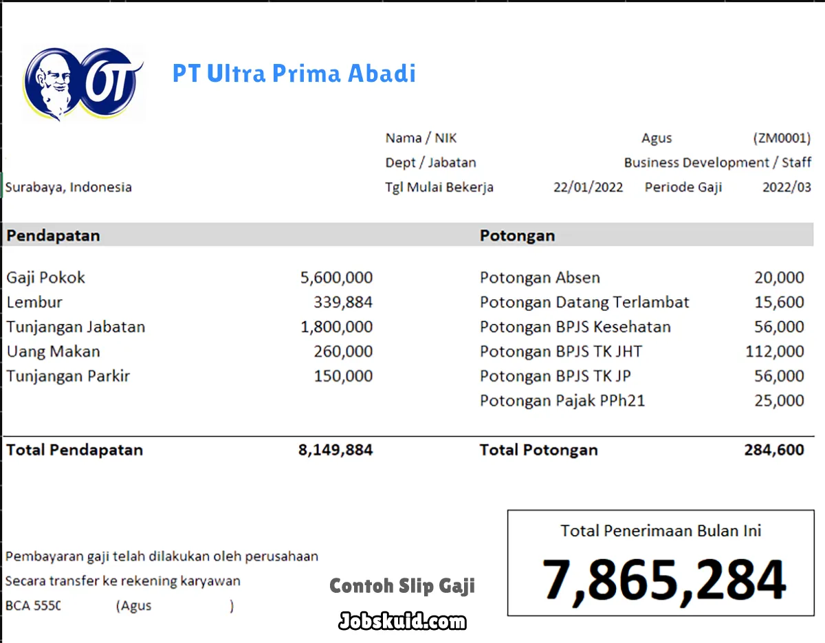 Gambar di atas adalah contoh slip gaji PT Ultra Prima Abadi. Slip gaji tersebut memuat informasi seperti gaji pokok, gaji lembur, bonus, tunjangan, potongan, dan total gaji.